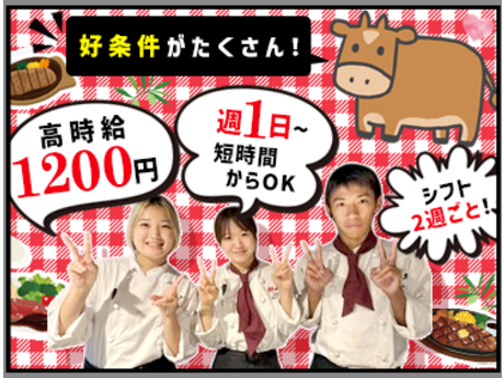 【鉄板焼き店のホール】人気の鉄板焼き屋さん!シフト2週おき→プライベートの予定もたてやすい!平日お昼歓迎!主婦(夫)さん活躍中!家庭都合の急なお休みもOK!